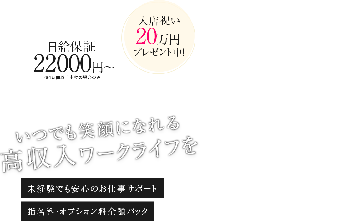 しかし出勤している時間はしっかり労働時間とするべき。という当店の考えから日給保証制度を導入しております。1日4時間以上出勤頂いた方には、下記の金額をお渡ししており、あなたの貴重なお時間が無駄になることは決してありませんのでご安心ください。